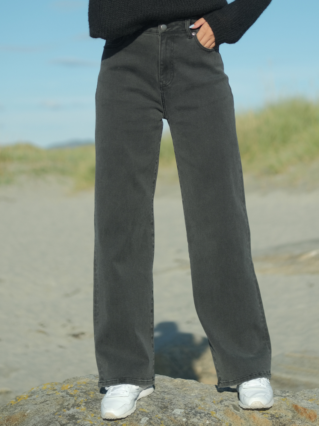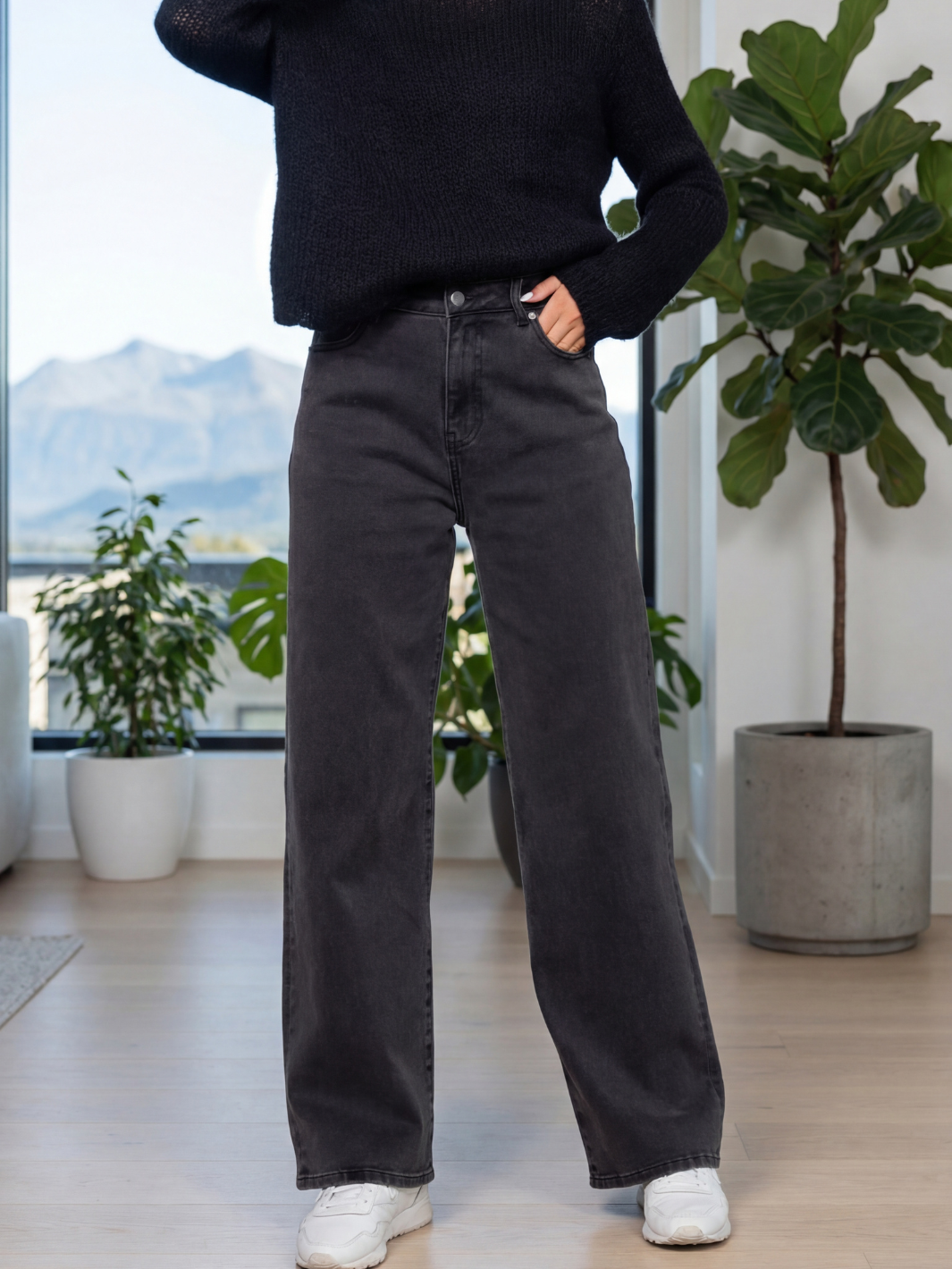 The high waist sits gently on the hips, and the wide, flowing legs fall effortlessly—equally striking with chunky sneakers or sleek boots. This is denim reimagined: relaxed yet sharpened, timeless yet endlessly stylish. With a reliable button-and-zip fly and two roomy back pockets, this is your go-to for bold looks that still feel effortlessly cool. Available in a washed black hue that amplifies its edgy urban aesthetic.