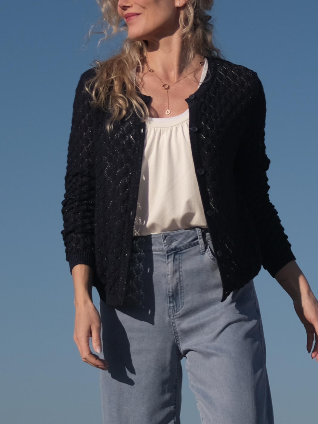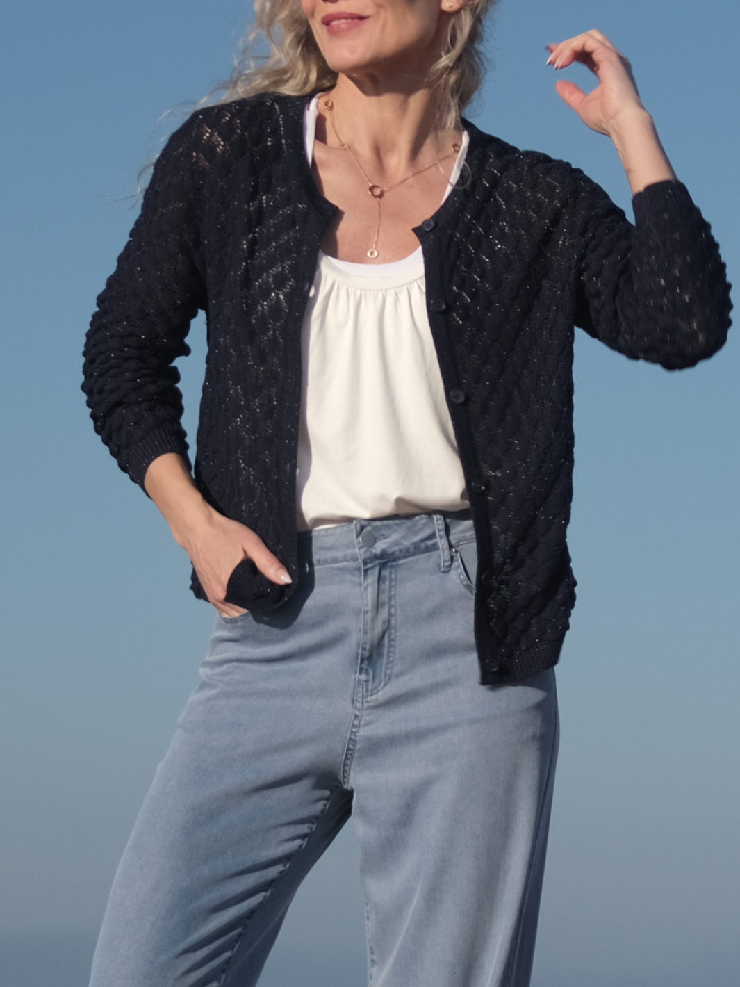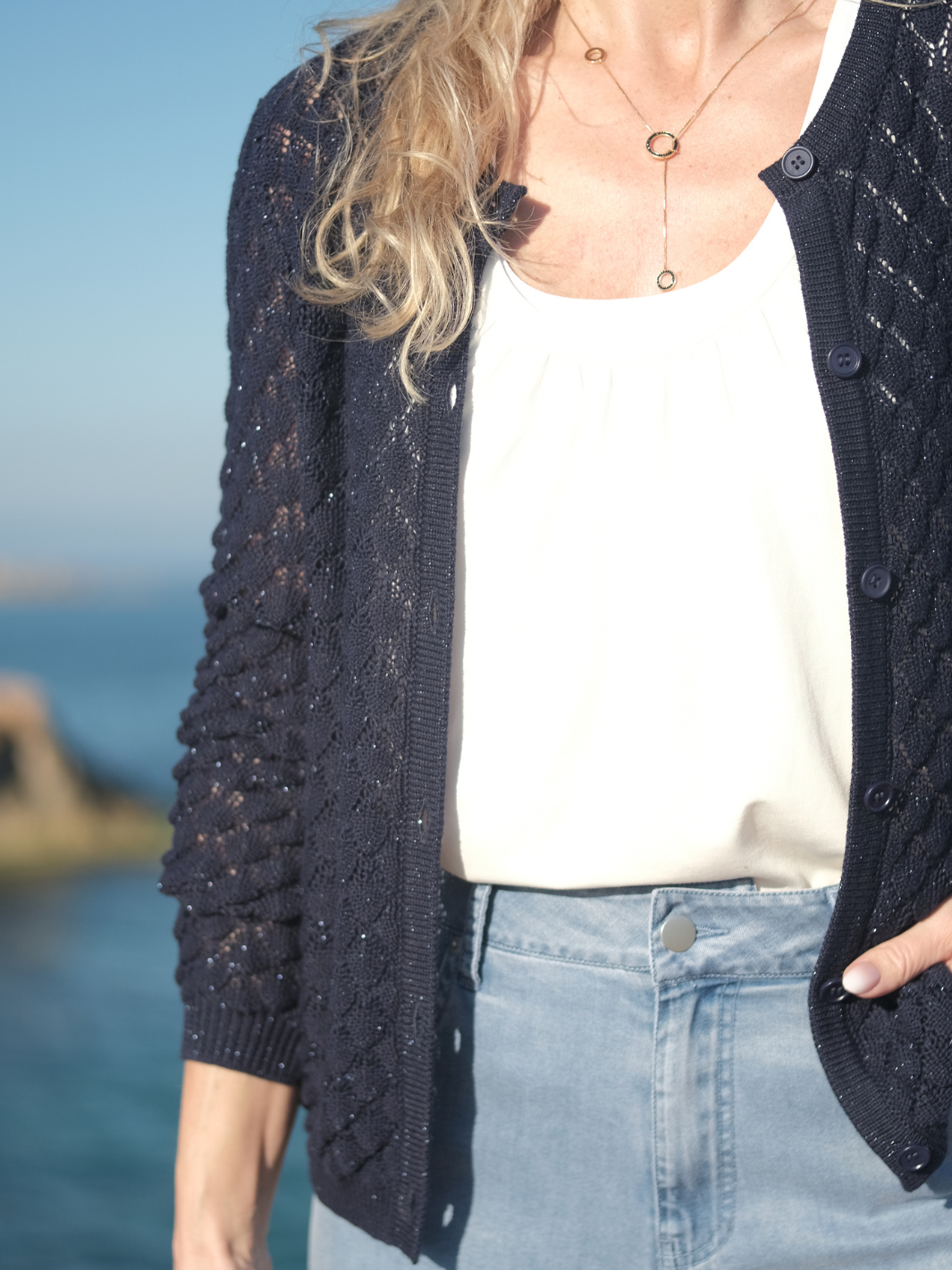Elegant marine blue cardigan in soft, lightweight cotton.